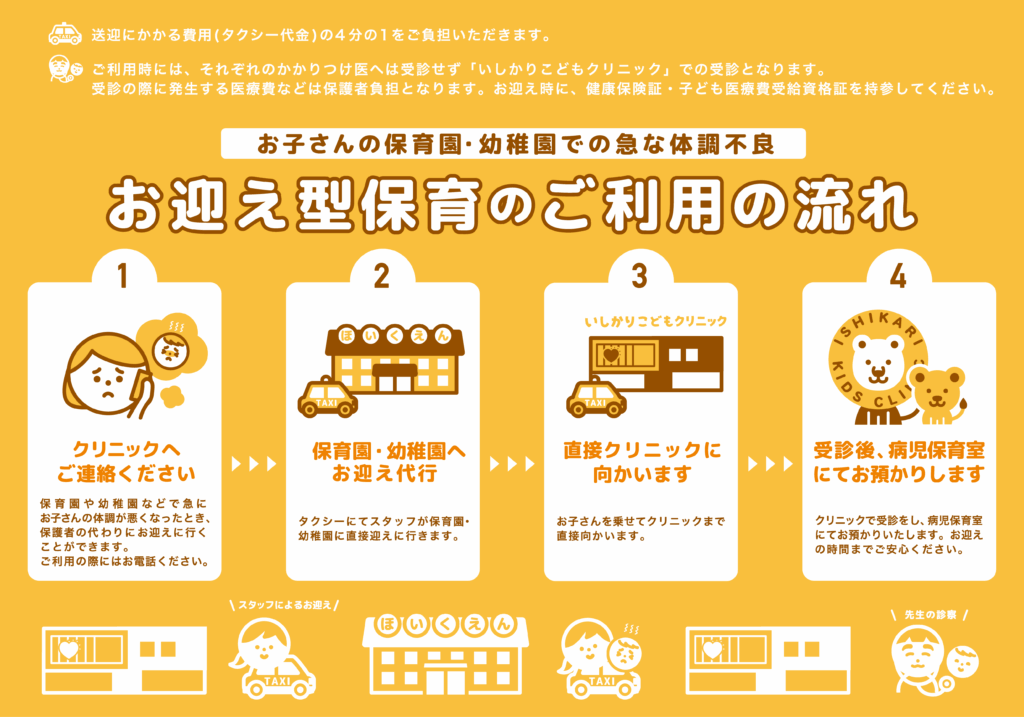 - 保育園や幼稚園などで急な発熱・体調不良があっても保護者に代わってお迎えします。